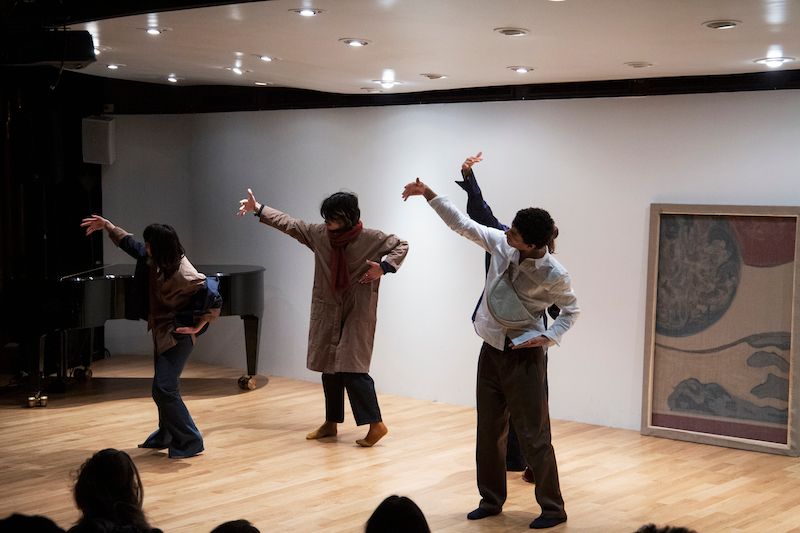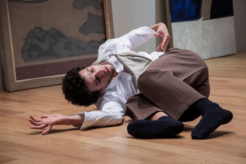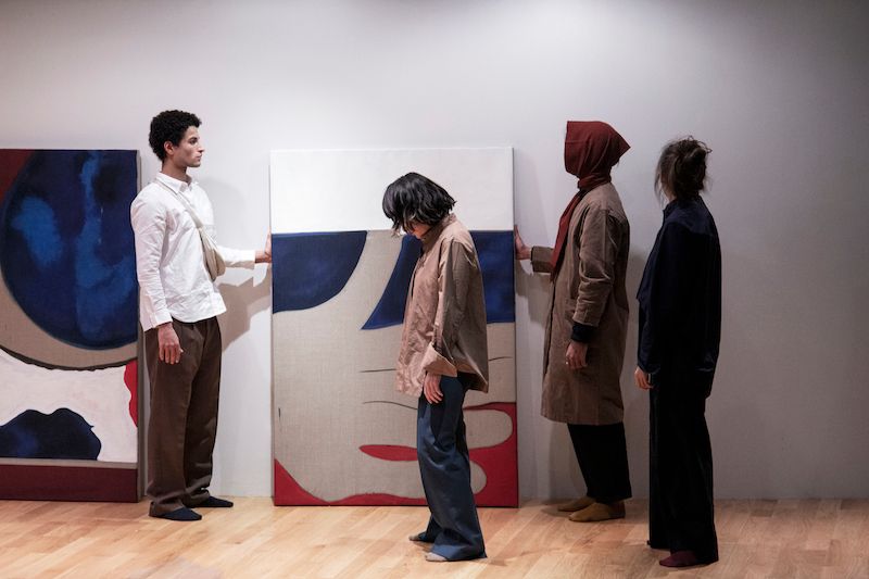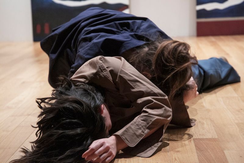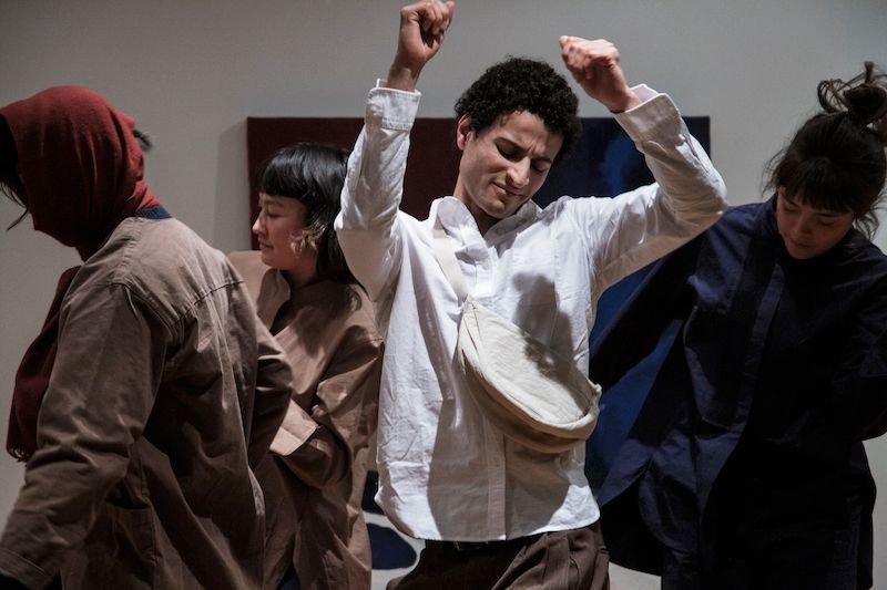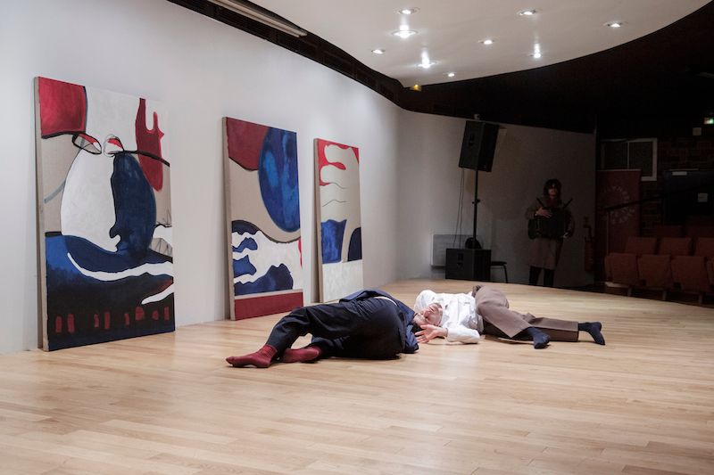 Performance, text, live music, dance, second hand clothes, oil, charcoal, Indian ink and felt tip pen on linen by Doppelganger Collective.