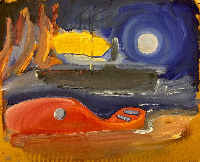 - We're living in a red submarine, oil on cardboard,